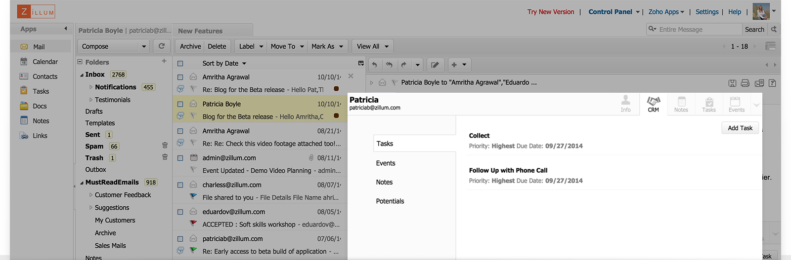 Gain quick access to leads, contacts, and templates within your CRM account directly from Zoho Mail.