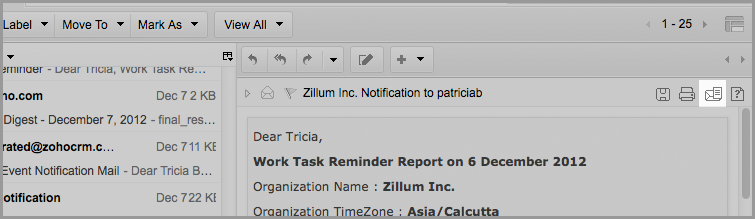 You can easily print both an individual email or the entire email conversation in a single click. When printing a email conversation, Zoho Mail allows you to print up to the first 100 emails in the conversation thread. Follow the steps mentioned below to print emails: