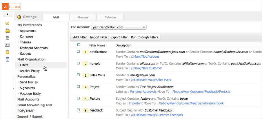 Automate incoming email handling. Use automatic filters to move mail from folder to folder, and tag them based on the criteria you define. You can also import filters from other sources.