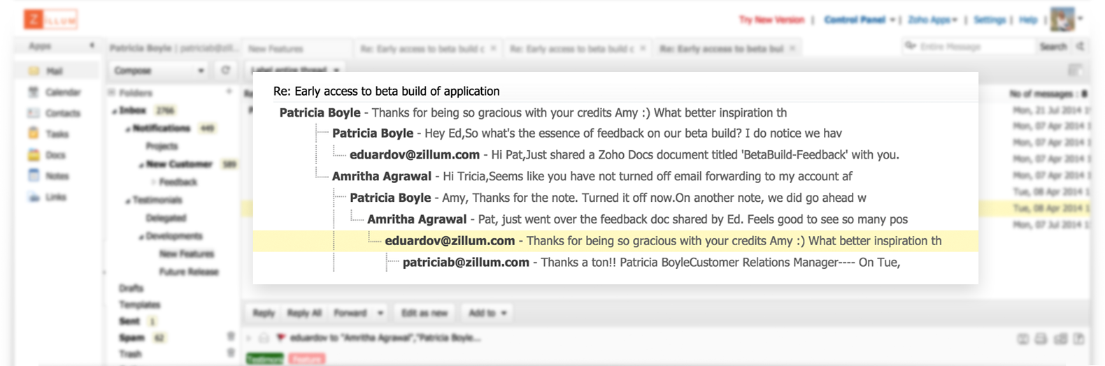 Related threads are presented in a nested-tree format. Clearly track the history of the email thread, to understand how an interaction unfolded.
