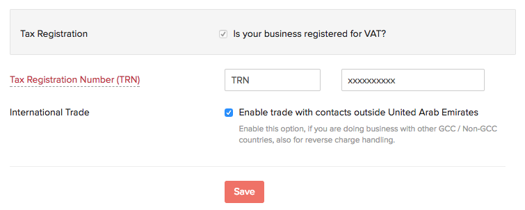 - If your business involves international trade (importing or exporting outside GCC), check the box Enable trade with contacts outside United Arab Emirates.