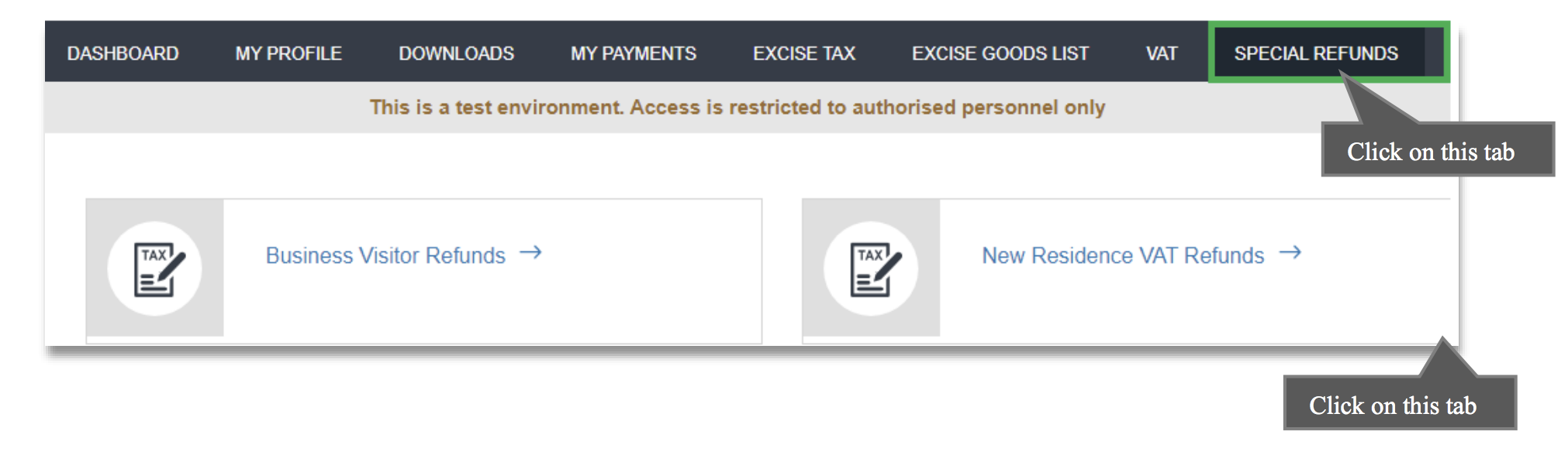 - Click on the New Residence VAT Refunds tab from the Special Refunds menu on the Taxable Person dashboard.