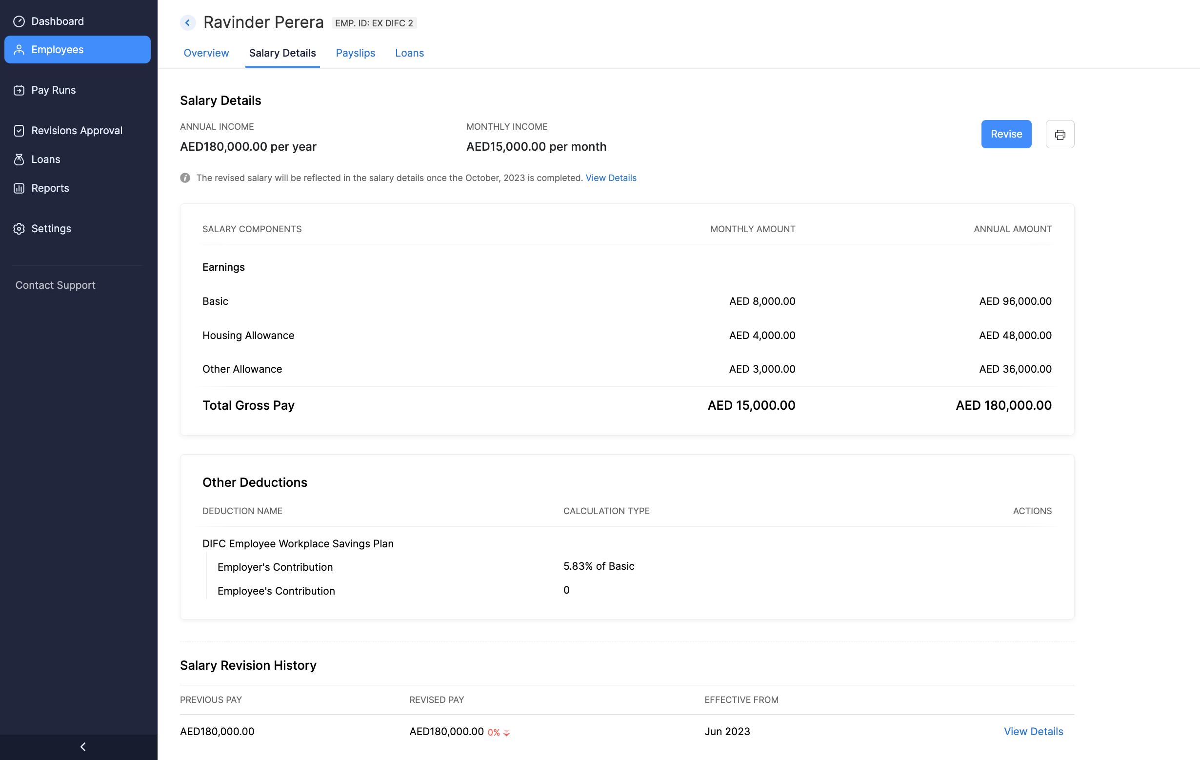 If your employee reaches a predefined goal or has shown continued excellent performance, you can reward them by giving them a pay hike. You can do this by revising their salary from the Employees module.