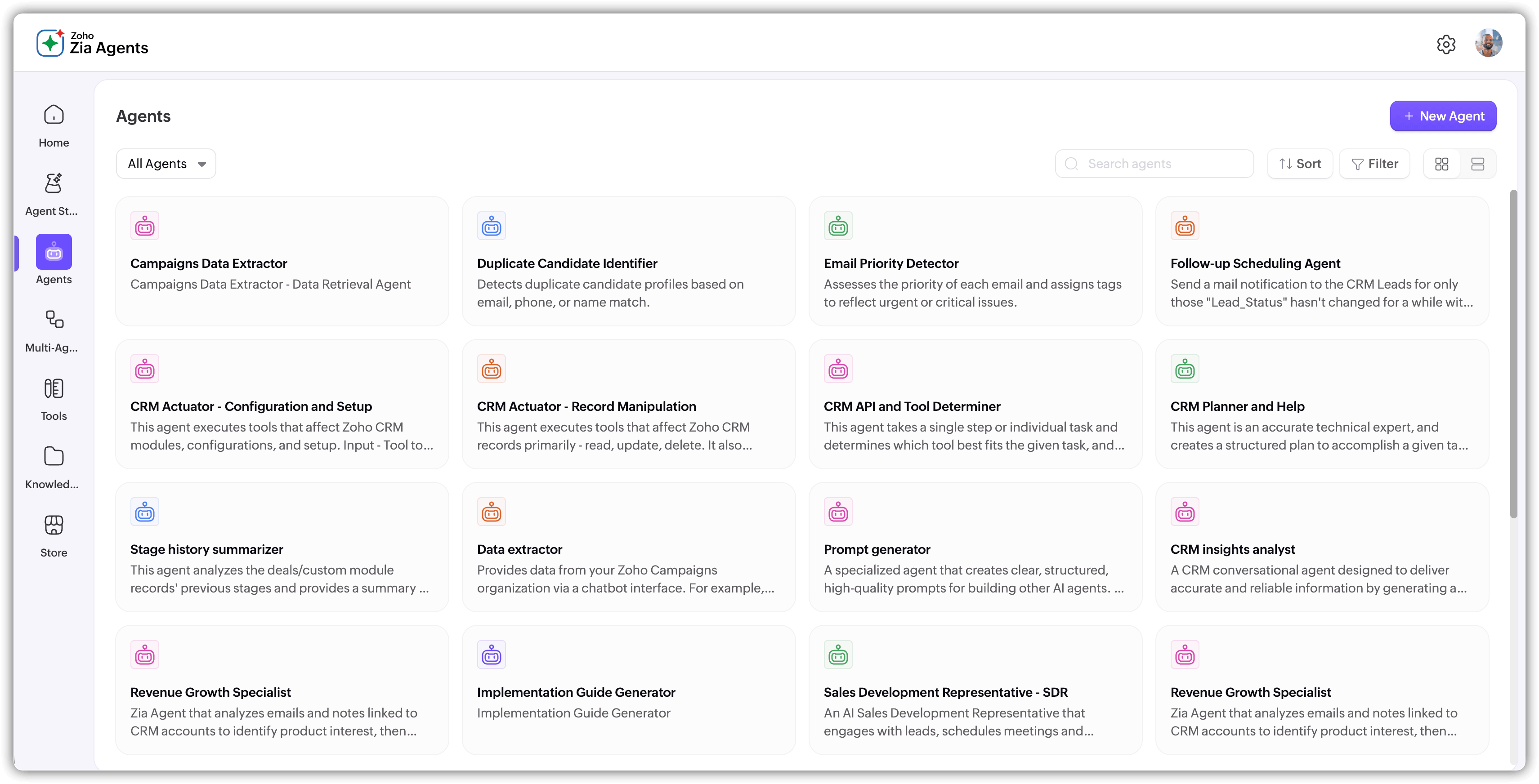 - Use the dropdown on the top left corner to view all agents, agents created by you, agents created by others at a glance.