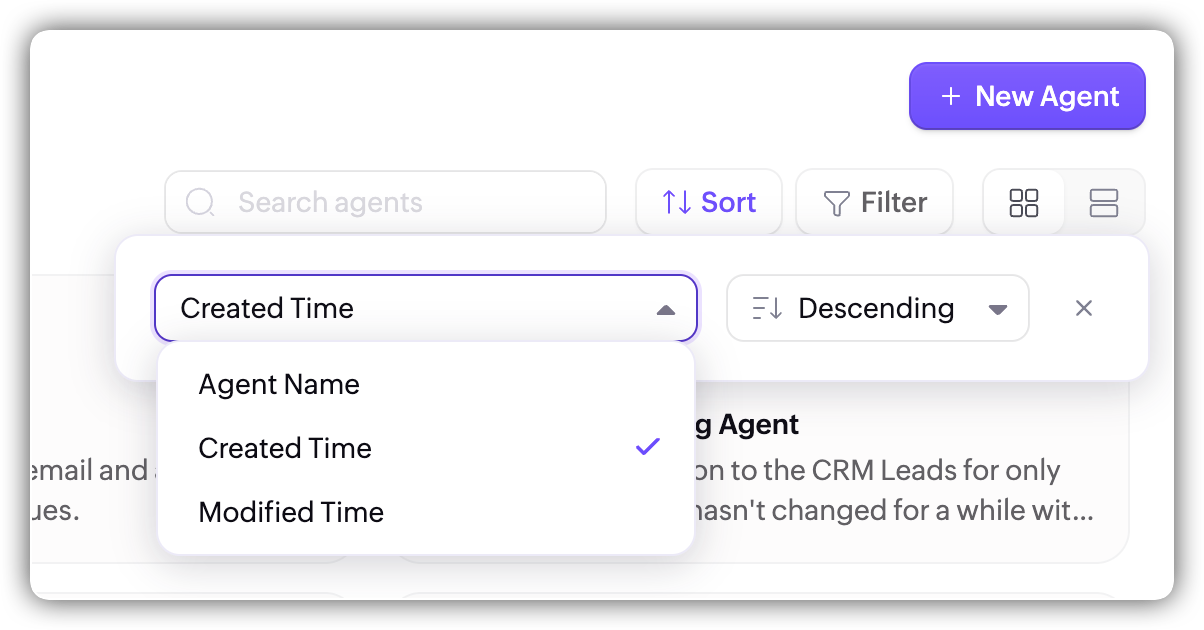 - Sort the agents as ascending or descending order of the agent name, created time, or modified time.