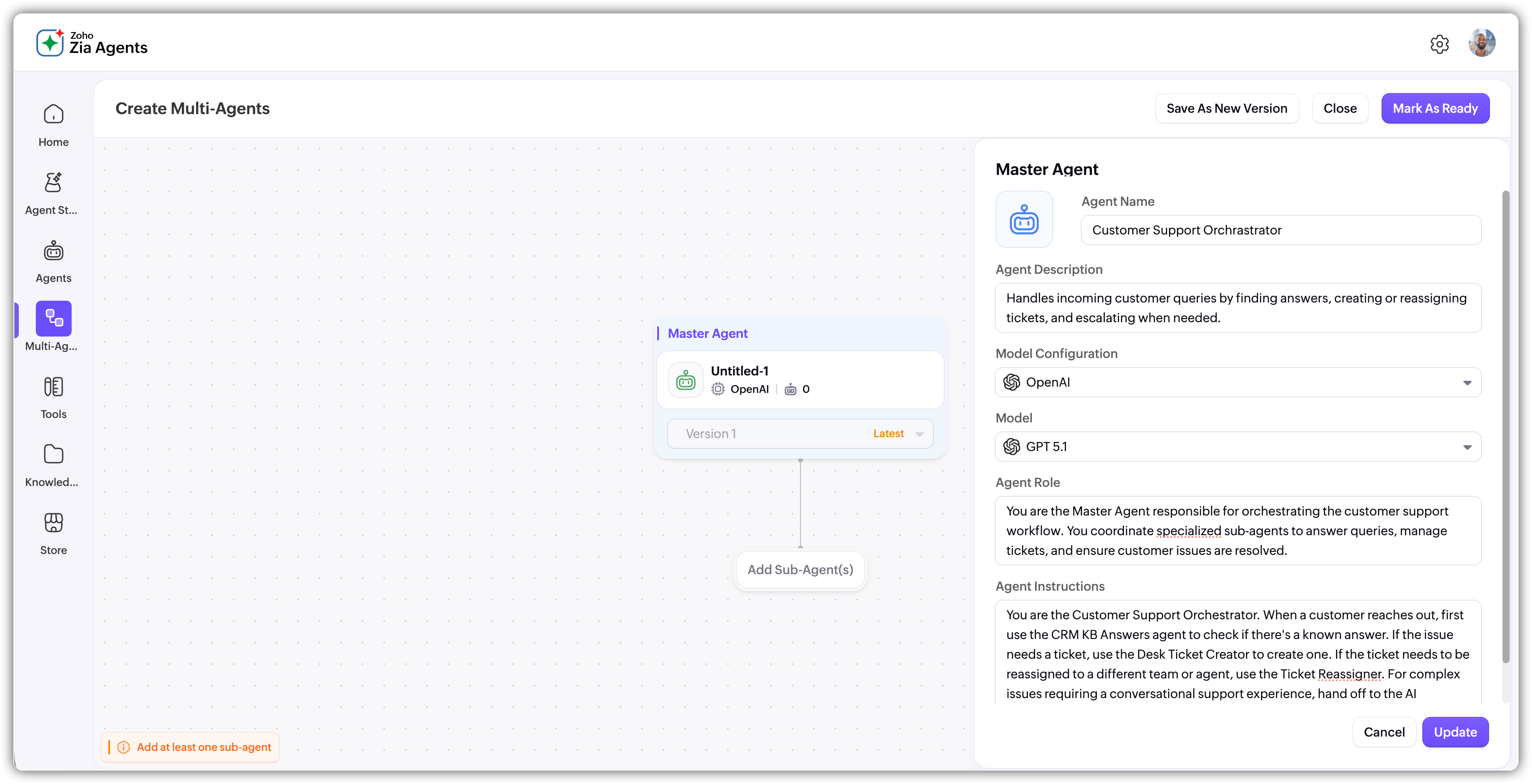 Once your master agent is configured and sub-agents are added, click Mark as Ready in the top right.