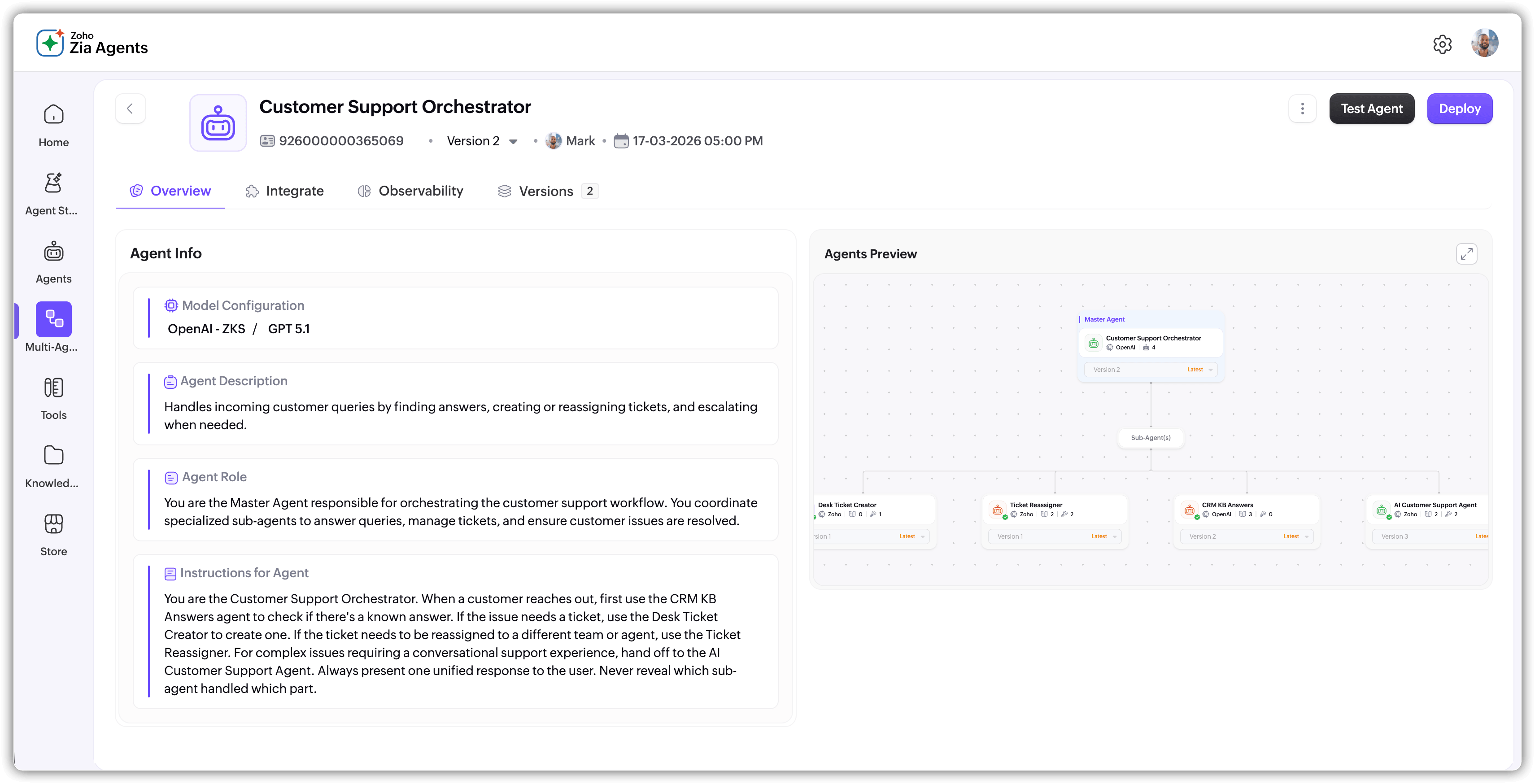 The Sub-Agents are the specialists. Each one is a regular Zia Agent you've already built and tested. They have their own tools, knowledge base, instructions, and guardrails. They do one thing well: fetch billing data, check policy, classify a ticket, search inventory, whatever their role is.