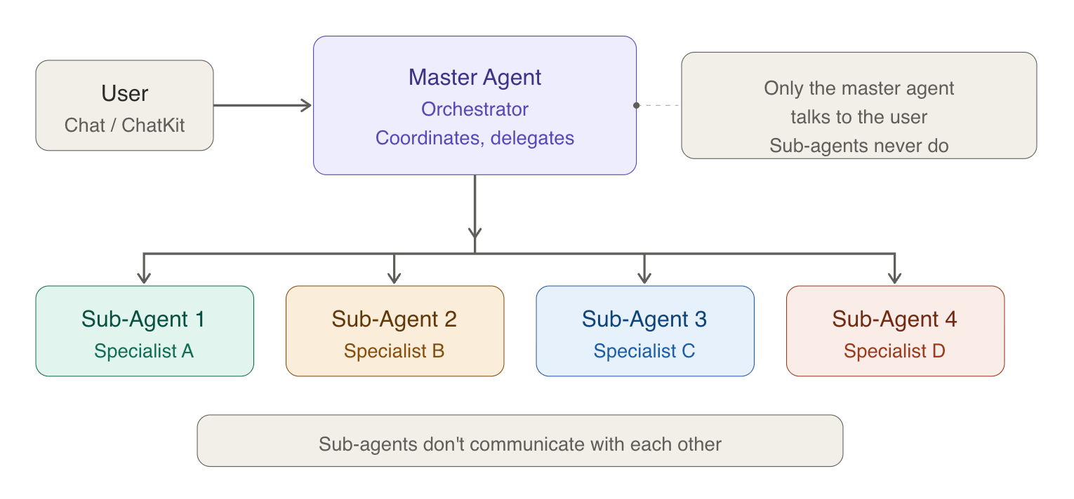 - Sub-agents never talk to the user directly. Everything goes through the master agent. From the user's perspective, they're chatting with one assistant, not a team.