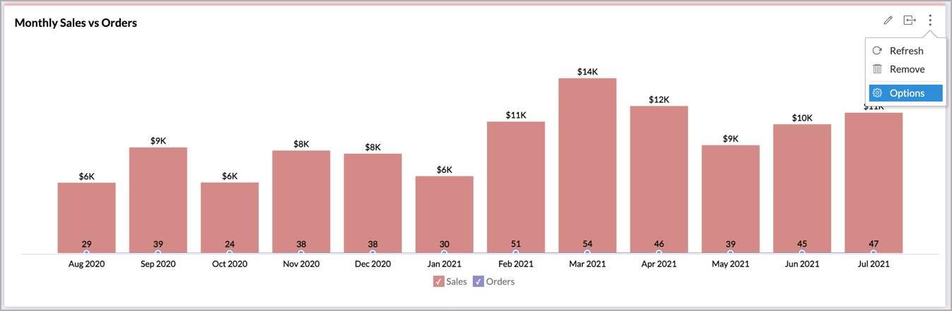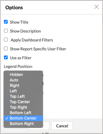- The legend settings that you choose for the chart here will override the already set legend settings that was set while creating the chart. Also, these changes are applicable only for this dashboard.