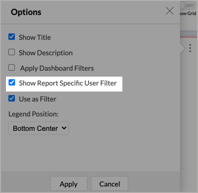 In Zoho Advanced Analytics, you can easily include/exclude the Users Filters from being applied on a specific report using the Apply Dashboard Filters option.