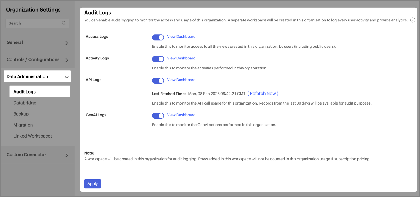 - API Logs - This enables you to monitor the API call usage in your organization.
