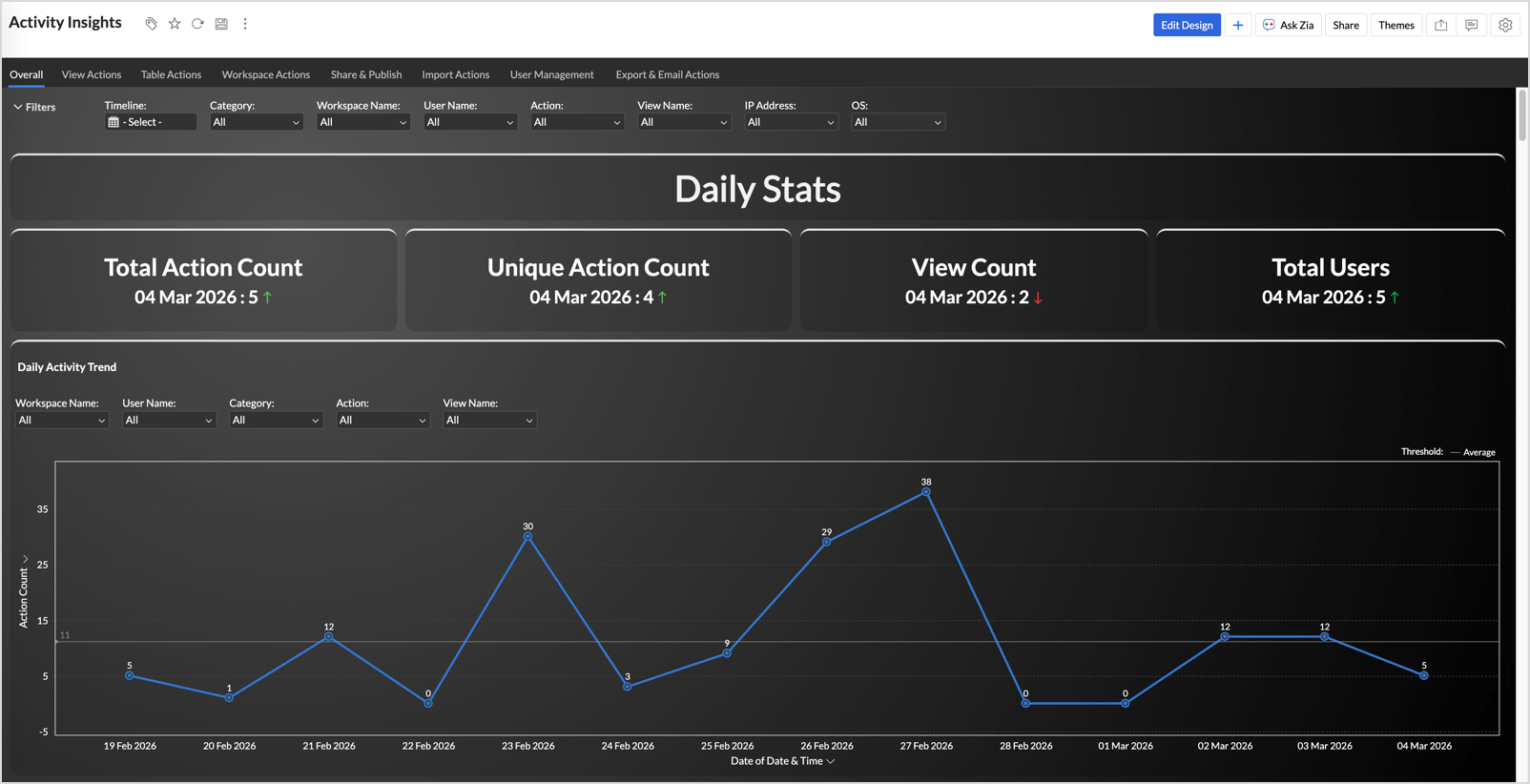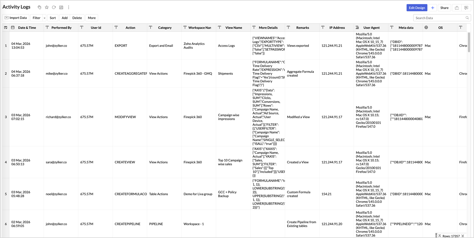 You can choose to log the users' activities or actions in your account such as importing data, creating reports, sharing reports etc. Through Activity Logs, you will know who performed these activities, when they were performed, and from where your account was accessed to perform these activities.