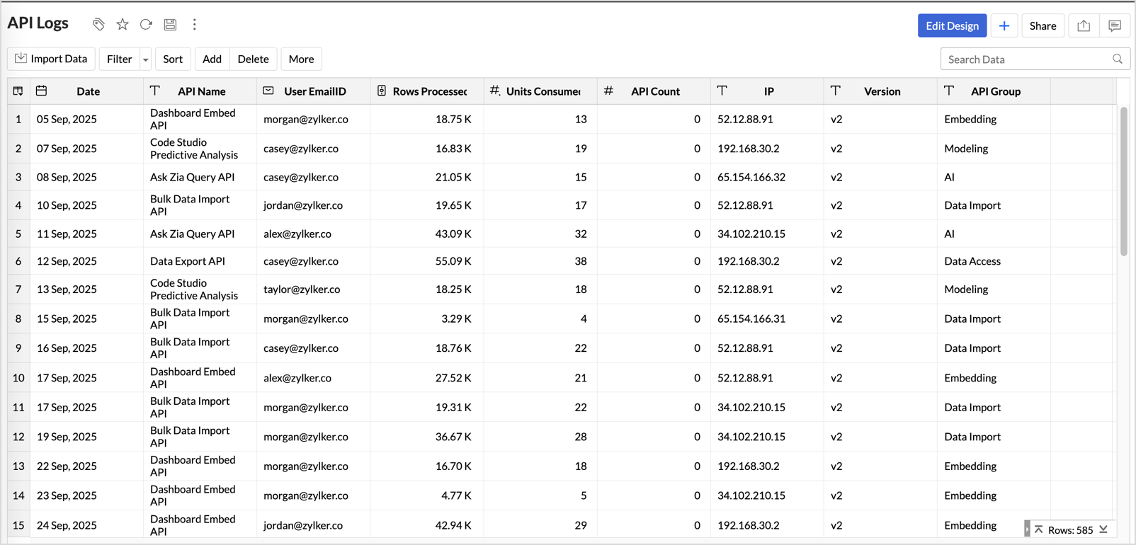 An API Log table will be created in the Zoho Analytics Audits workspace with the below columns.