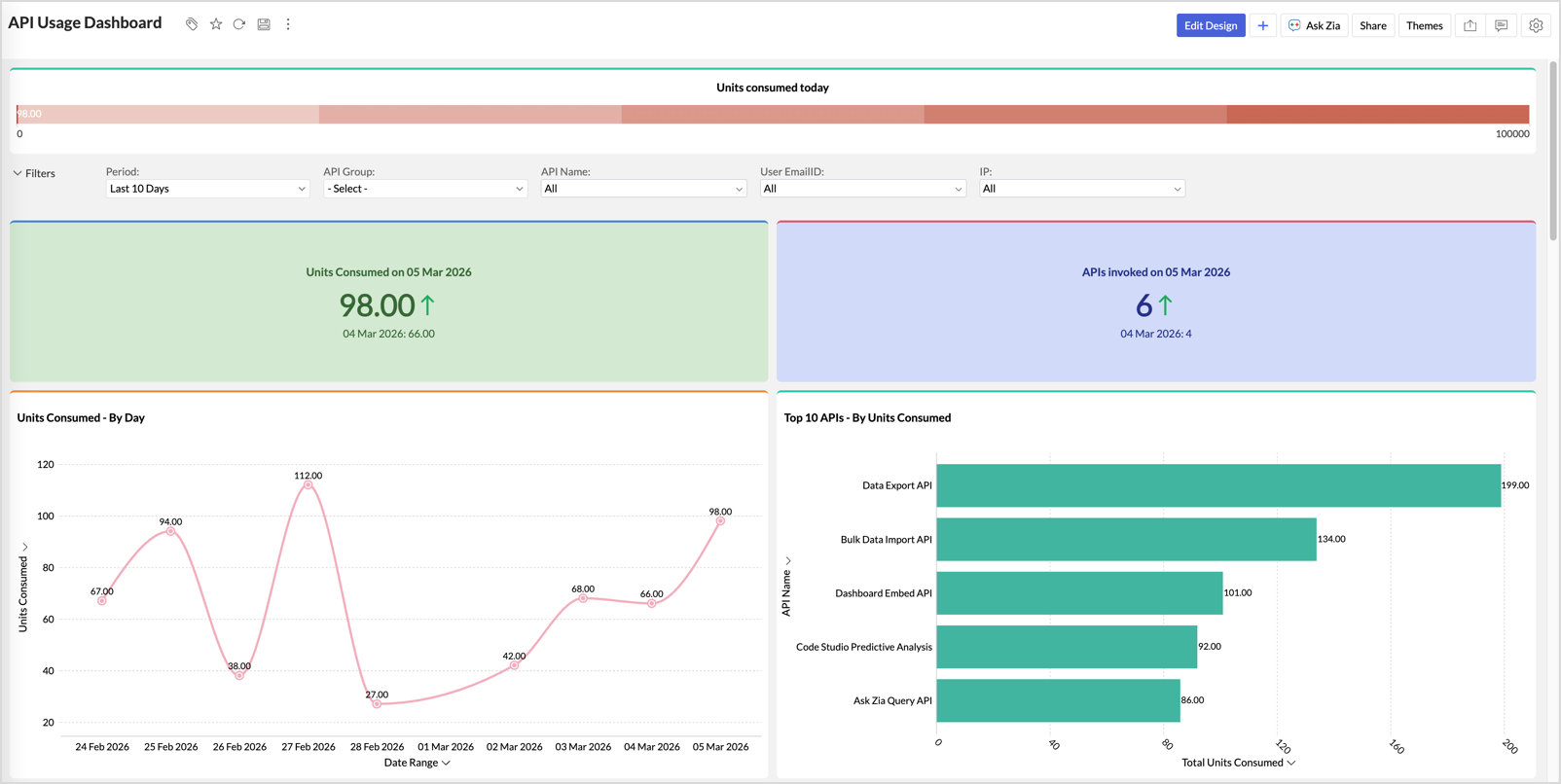 An insightful API Log Analytics Dashboard capturing the essentials of the API log such as Units Consumed - By Day, Request Count - By API Groups and Top 10 APIs - By Units Consumed or By Request Count, etc., will also be automatically created.