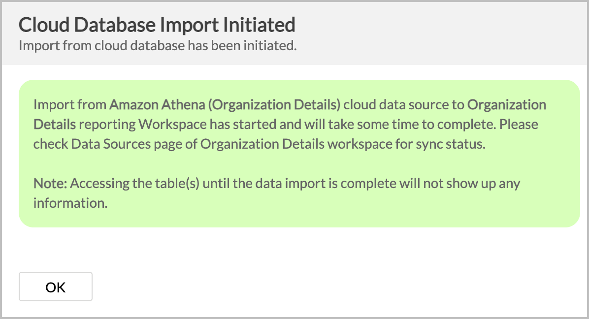 After setup, you might have to wait sometime for the initial fetch to happen. This depends upon the amount of data to be imported into Zoho Analytics and also the response time of your Amazon Athena server. You will receive an email notification once the import is complete. Please note that, if you access the workspace before the initial fetch, it will not display any data.