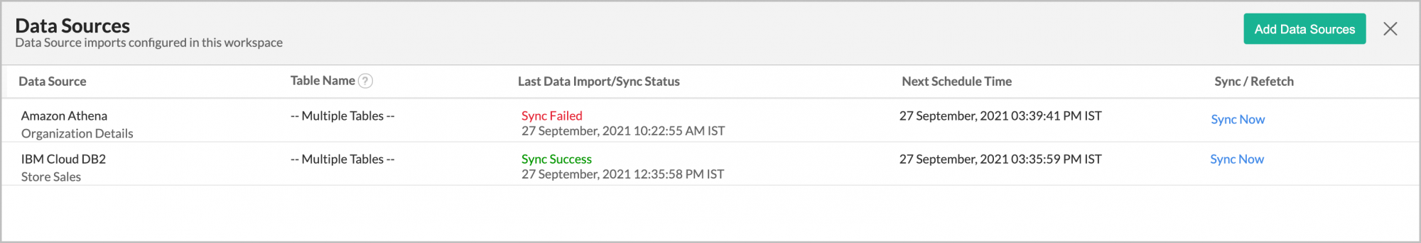- The Last Data Sync Status in Datasources page shows Sync Failed. How do I resolve it?