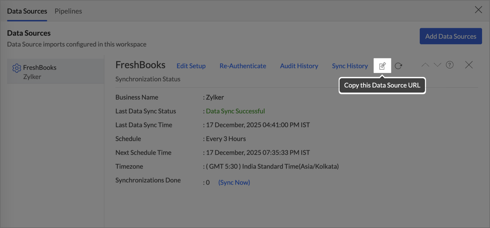 The Data Source Permalink helps you easily access the data source tab. Only the Organization Admin and Account Admin can make changes in the Data sources page, other users can know the synchronization details like whether the last data sync was successful or not, when the last data sync happened, when the next sync is scheduled to happen, etc. This link can also be pasted in dashboards so that everyone accessing the dashboard can know about the sync status.