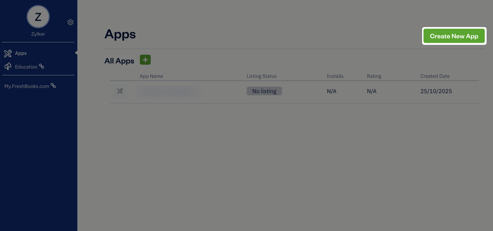 - Open the FreshBooks Developer Console and click Create New App on the Apps page.