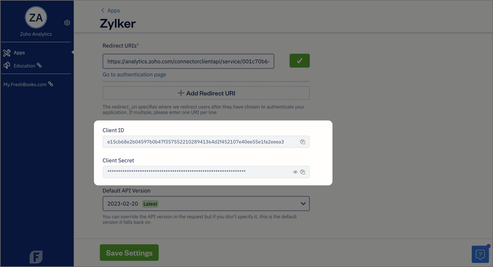 - Once created, open the app from the Apps page and copy the Client ID and Client Secret. These credentials are required to configure the FreshBooks connector in Zoho Analytics.