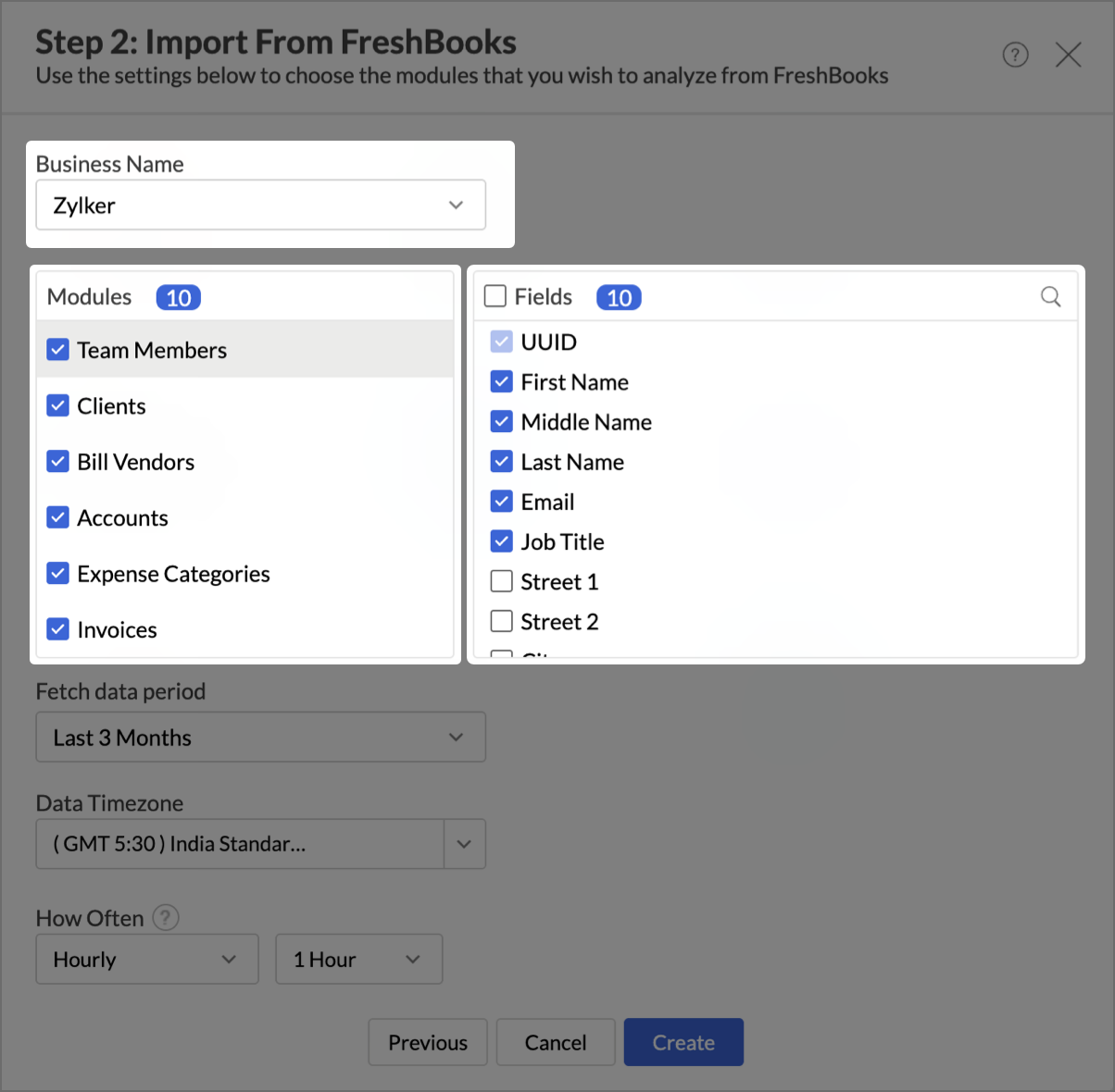 - From the Step 2: Import from FreshBooks dialog select the Business Name and select their Modules and Fields from which you intend to import data.