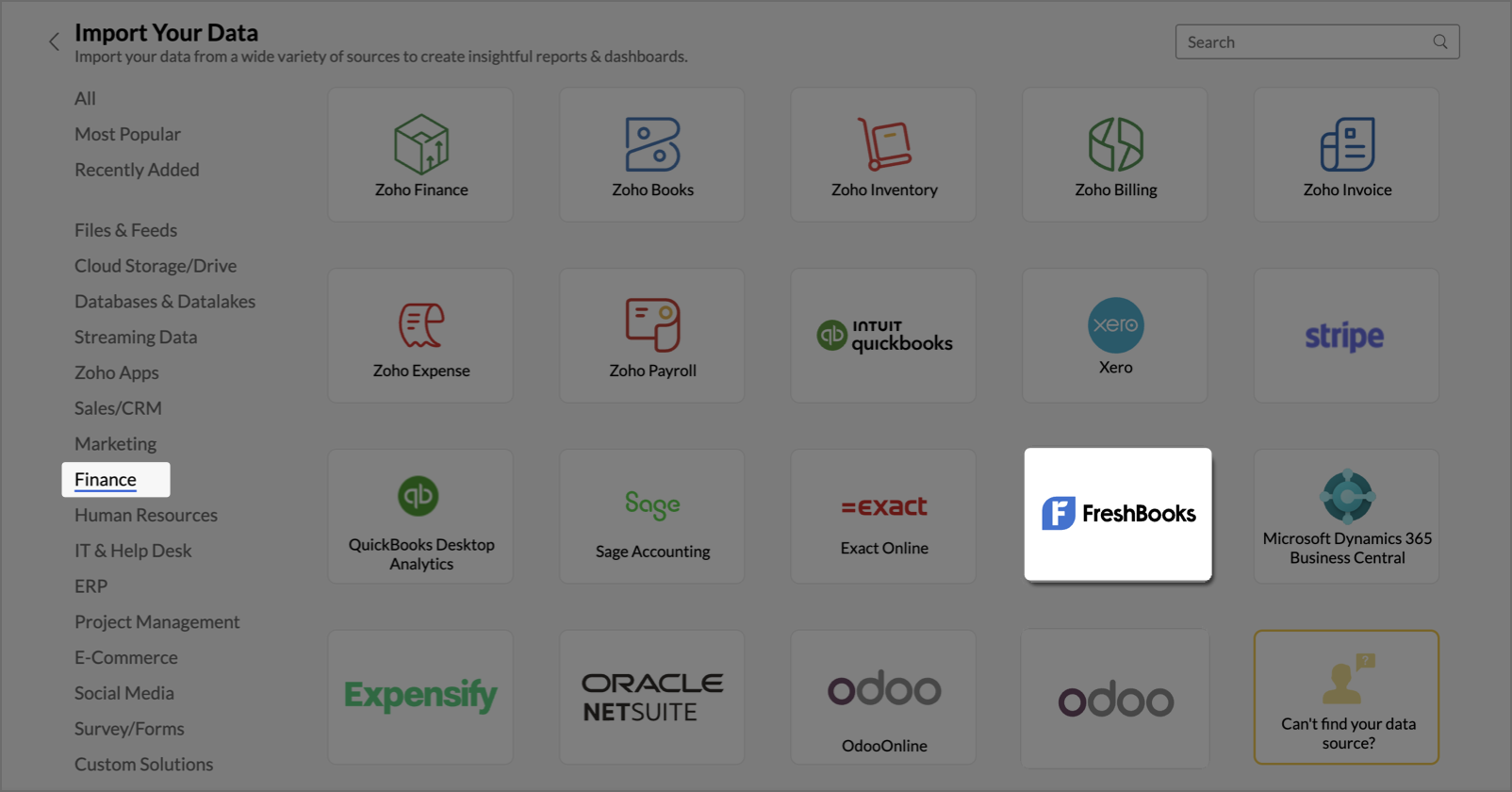 - Navigate to the Finance tab and select FreshBooks from the available data sources.