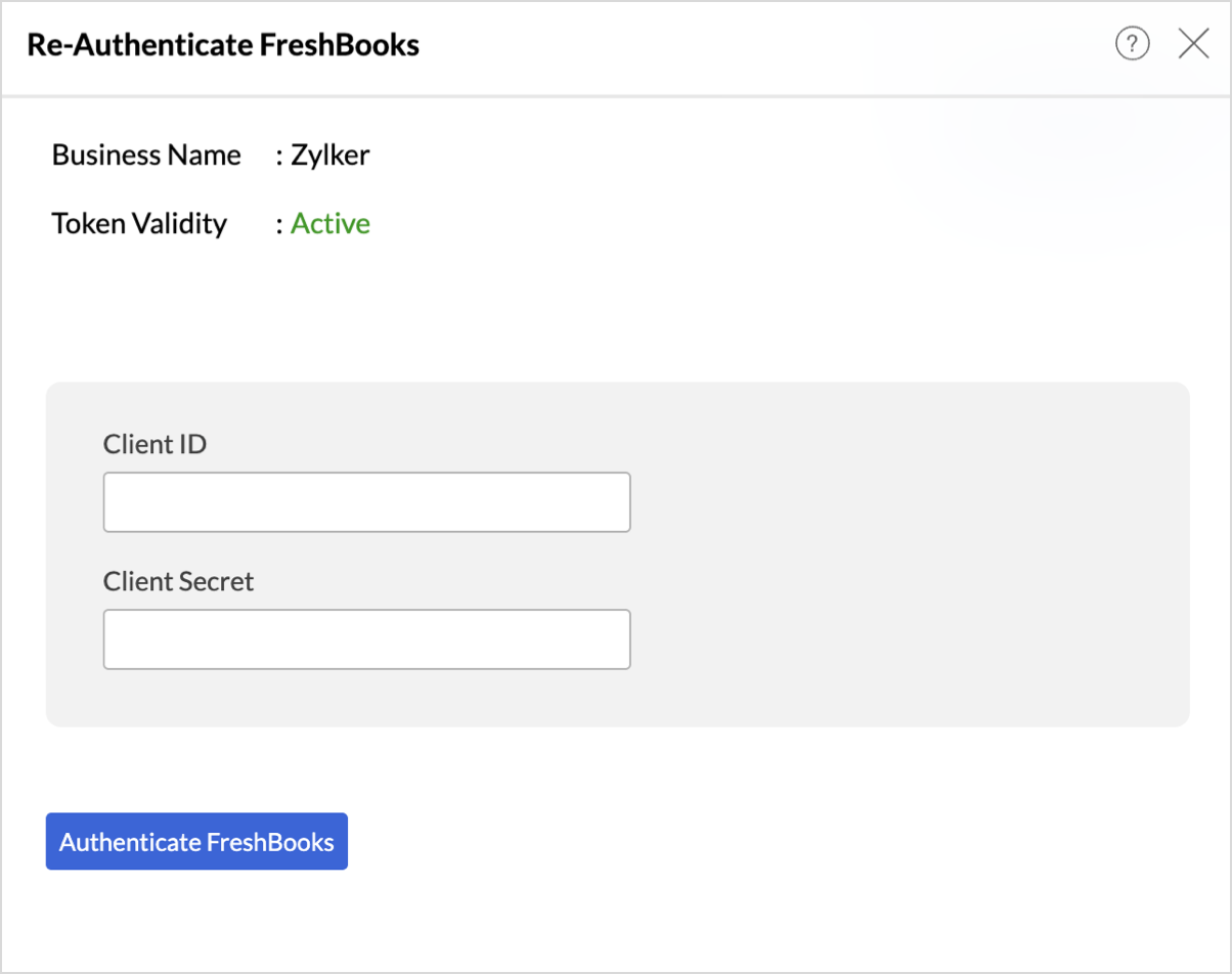 - The Re-Authenticate - FreshBooks dialog will open. Enter the credentials and click Authenticate FreshBooks.