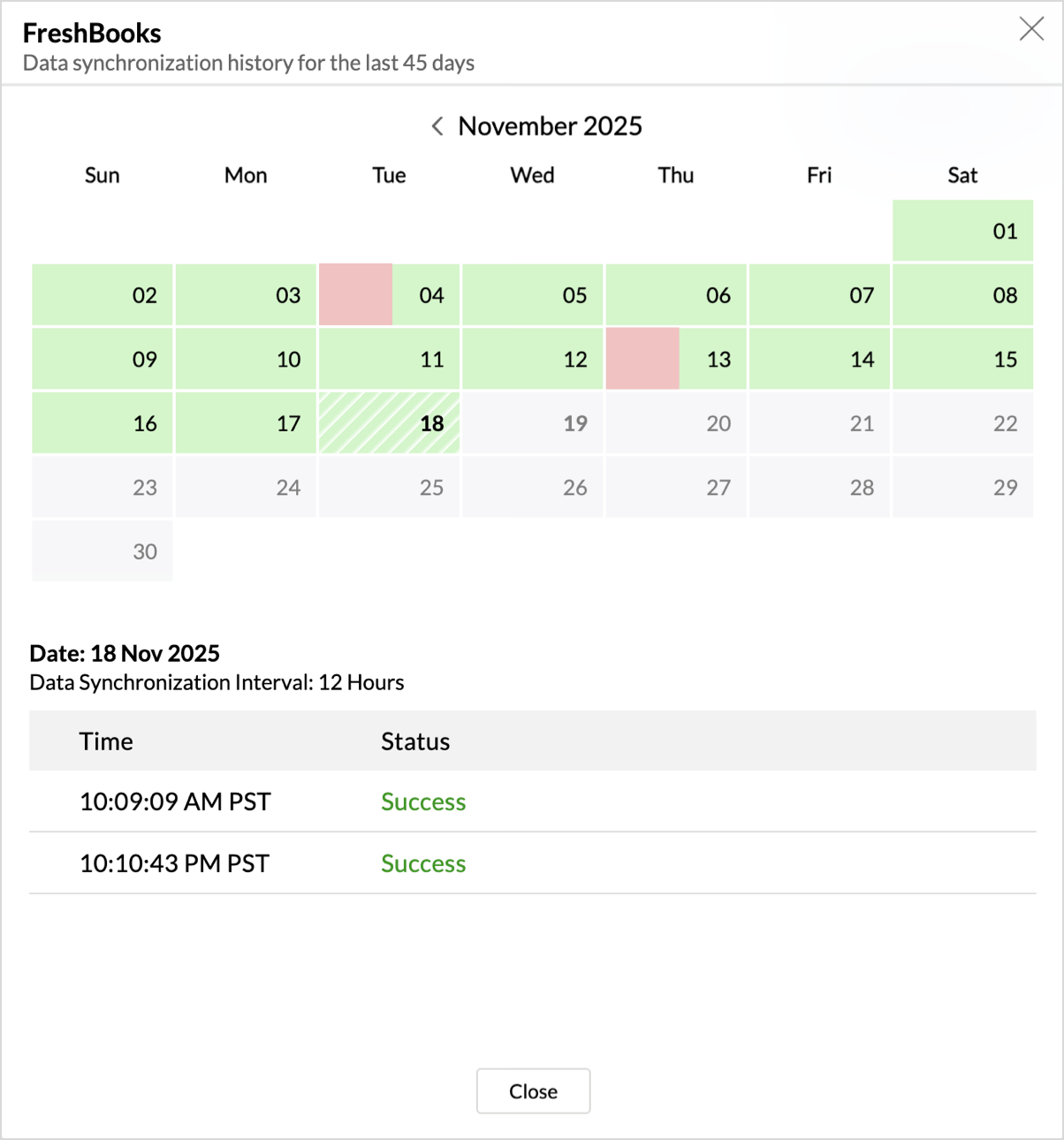 - A calendar with the Sync History of the last 45 days will open. The date when the data sync has happened will be highlighted. Hover to view the number of times the data had got synced on a specific date.