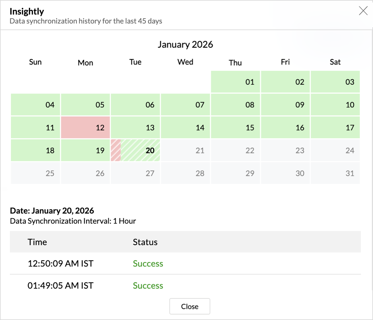 - A calendar with the Sync History of the last 45 days will open. The date when the data sync has happened will be highlighted. Hover to view the number of times the data had got synced on a specific date.