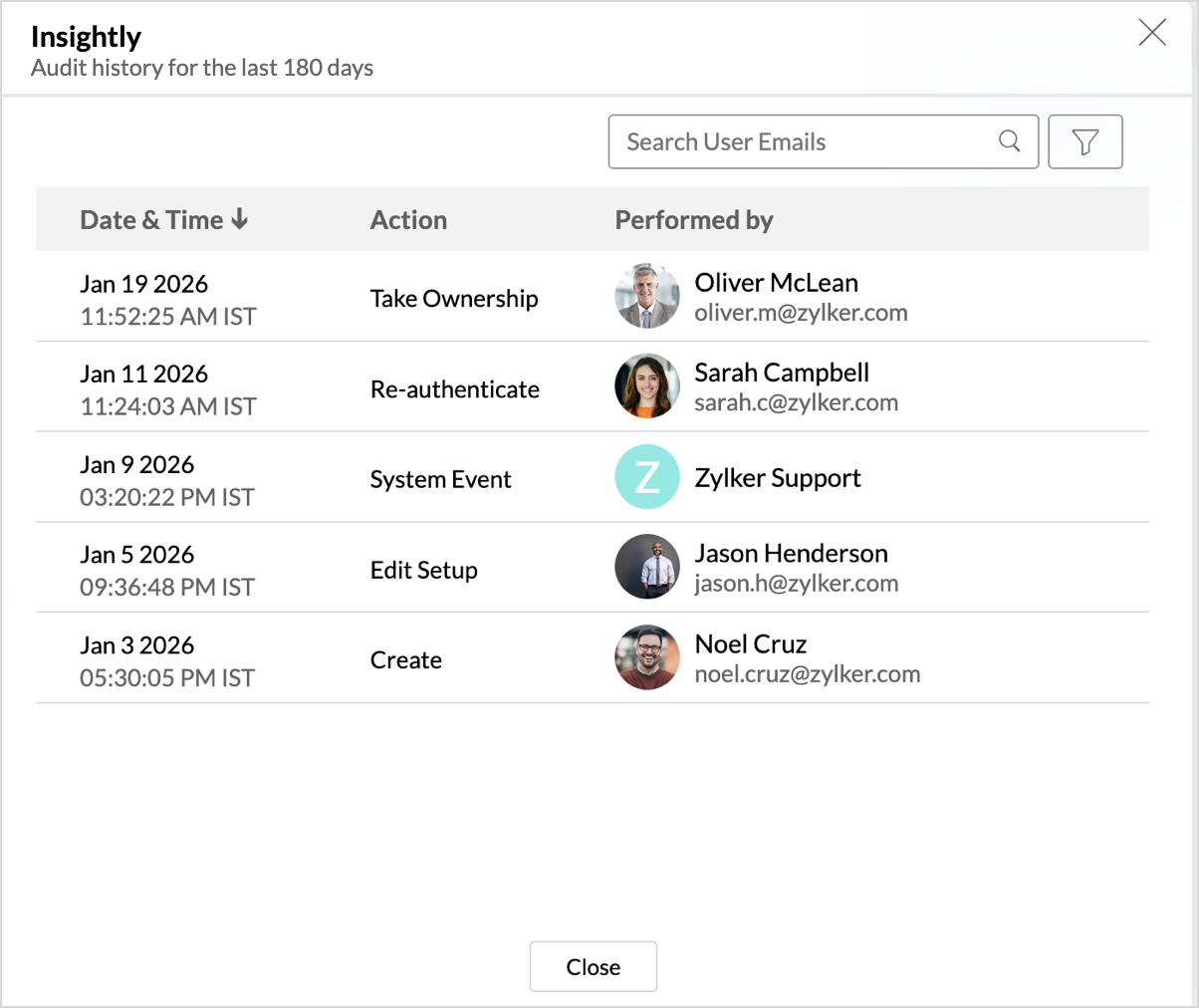 Zoho Analytics logs all the user activities and system events within the Insightly workspace. The following actions are logged in Zoho Analytics,