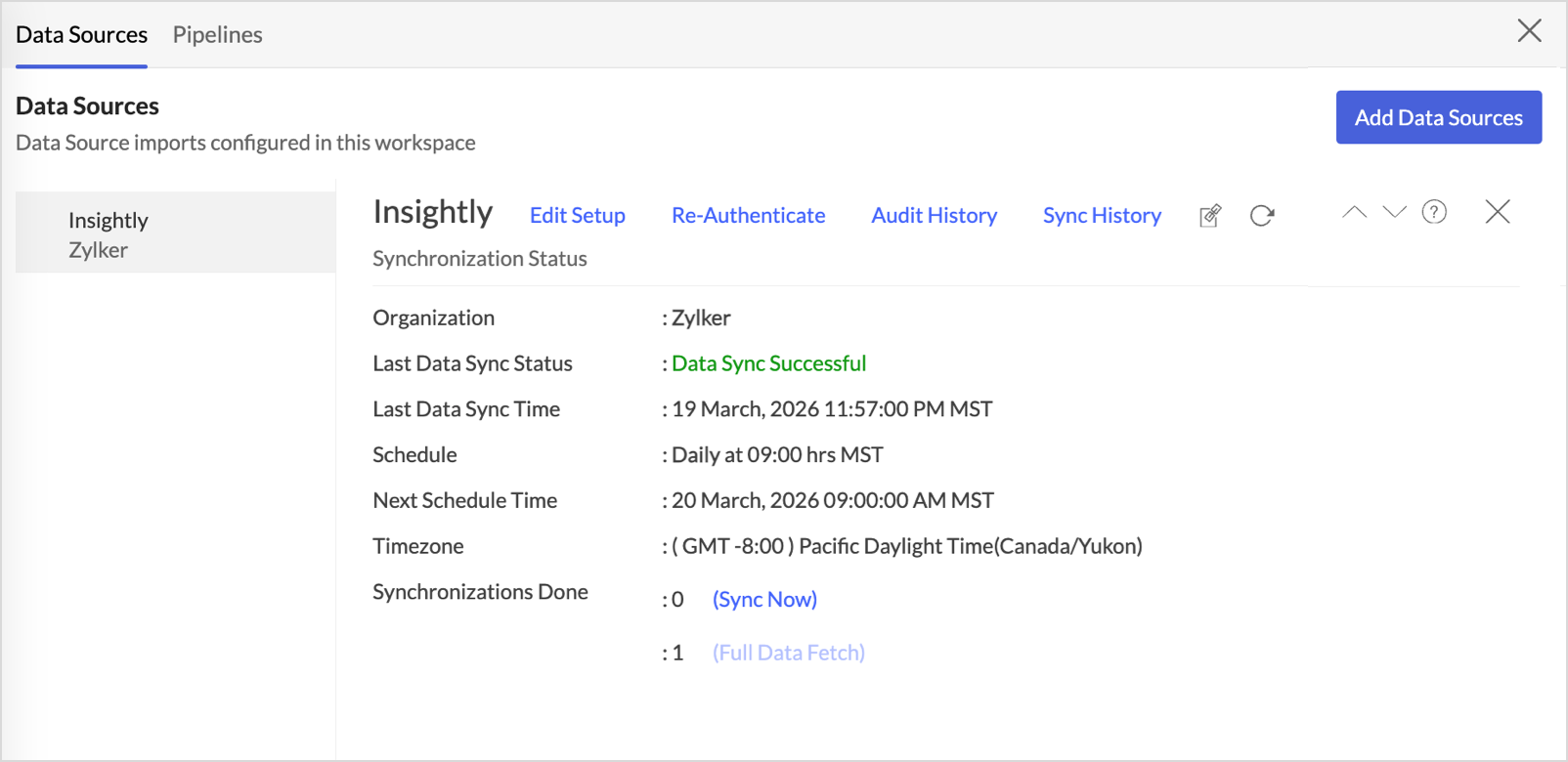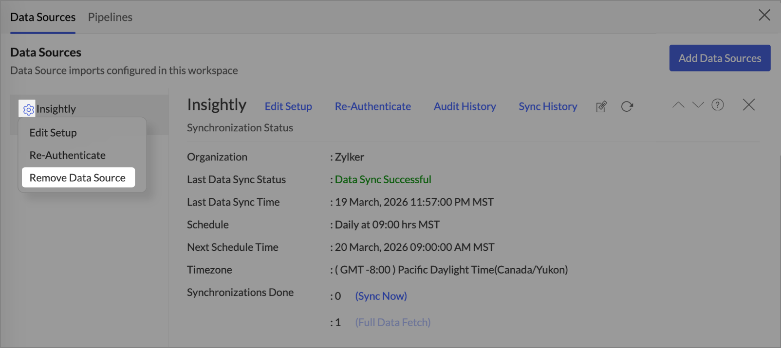 Click Data Sources > Re-Authenticate.The Re-Authenticate Insightly dialog will open. Click Authenticate Insightly and enter the Insightly credentials to re-authenticate.