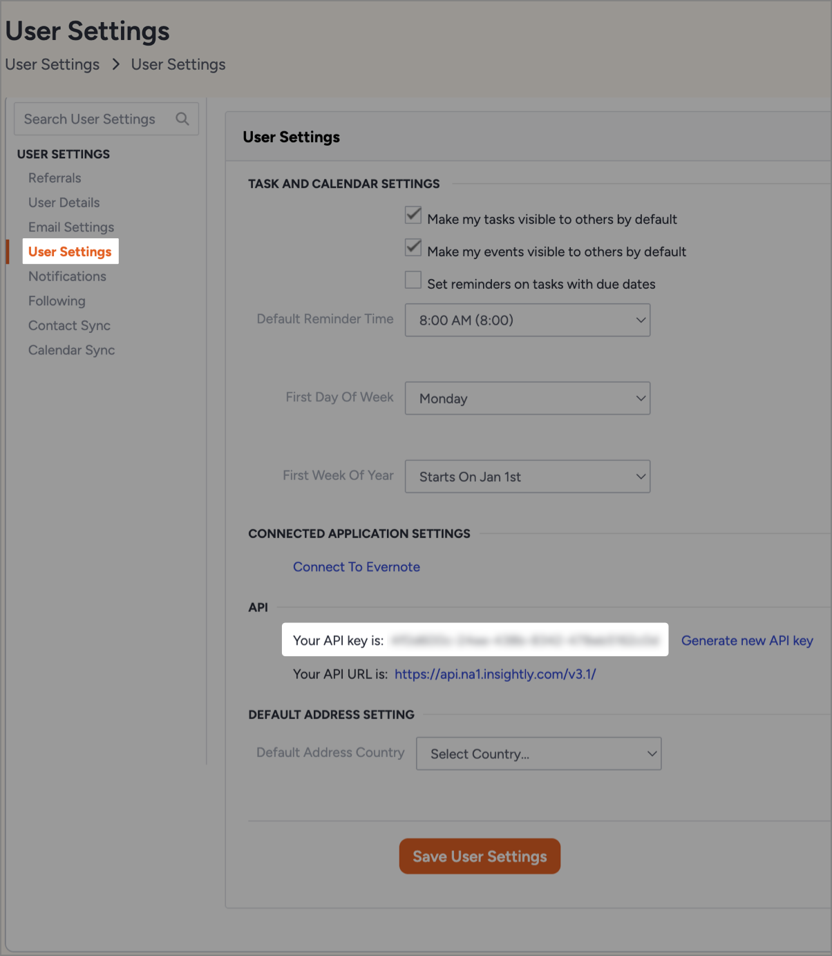 - Navigate to User Settings and you can find your API key as shown below.