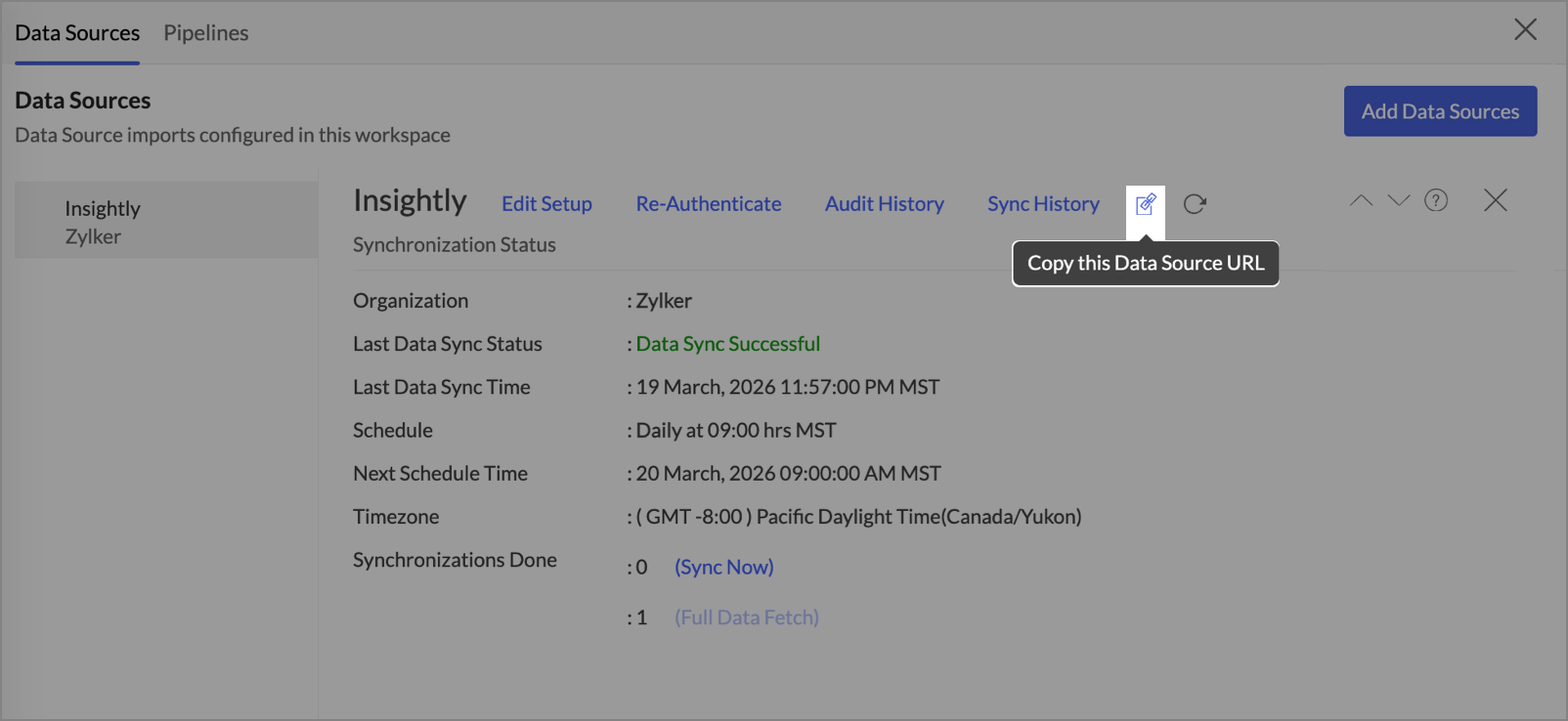 The Data Source URL helps you easily access the data source tab. Only the Organization Admin and Account Admin can make changes in the Data sources page. Other users can know the synchronization details like whether the last data sync was successful or not, when the last data sync happened, when the next sync is scheduled to happen, etc.