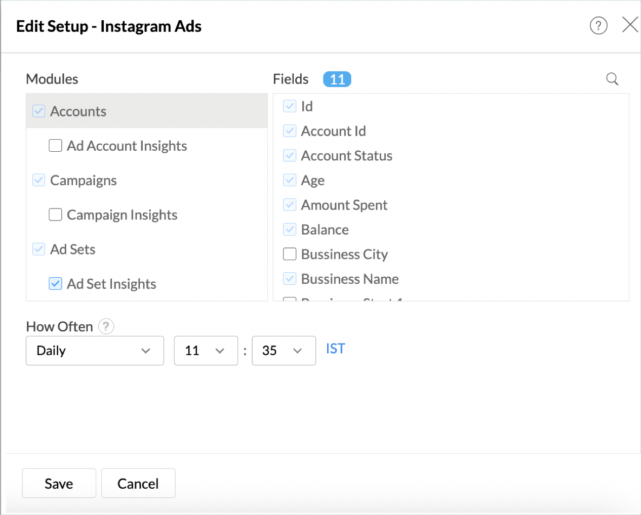 A lookup relationship will be created automatically between the Instagram Ads modules and the modules of Zoho CRM, Zoho Desk, Salesforce CRM, and Zendesk. If you wish to blend Instagram Ads modules with applications other than the ones mentioned, you will have to link the related modules from Instagram Ads and the other applications manually, using a lookup relationship.