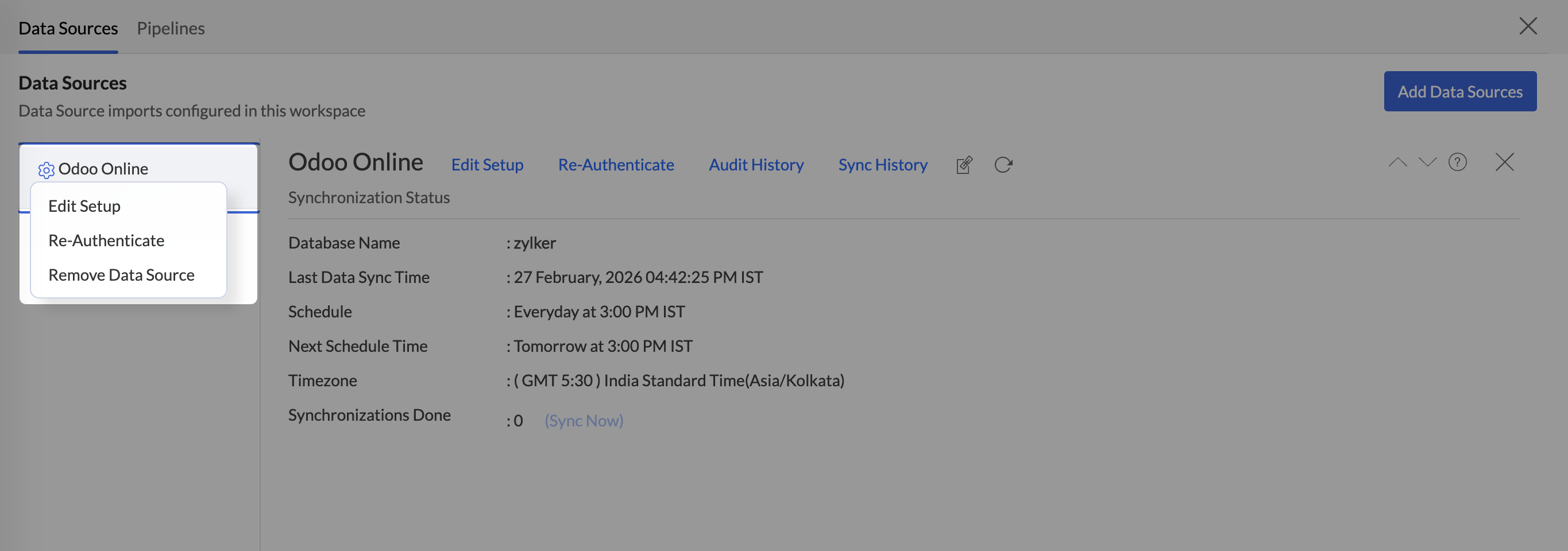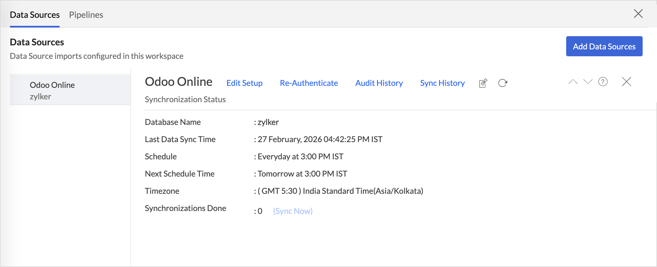 Users with Administrator Privileges can configure the connection between Odoo Online and Zoho Analytics.