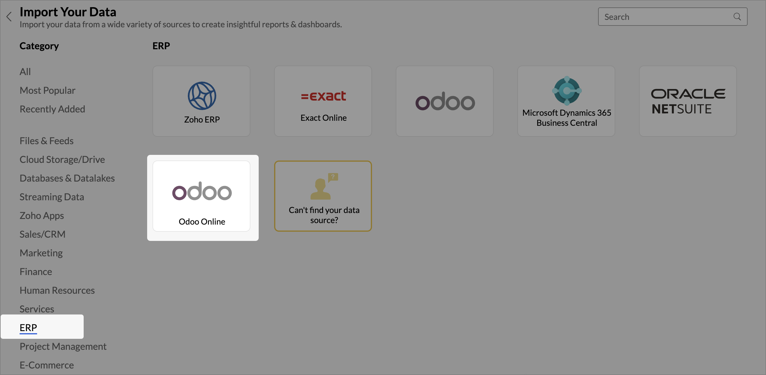 - All the data sources will be listed. Access the ERP tab and choose Odoo Online.