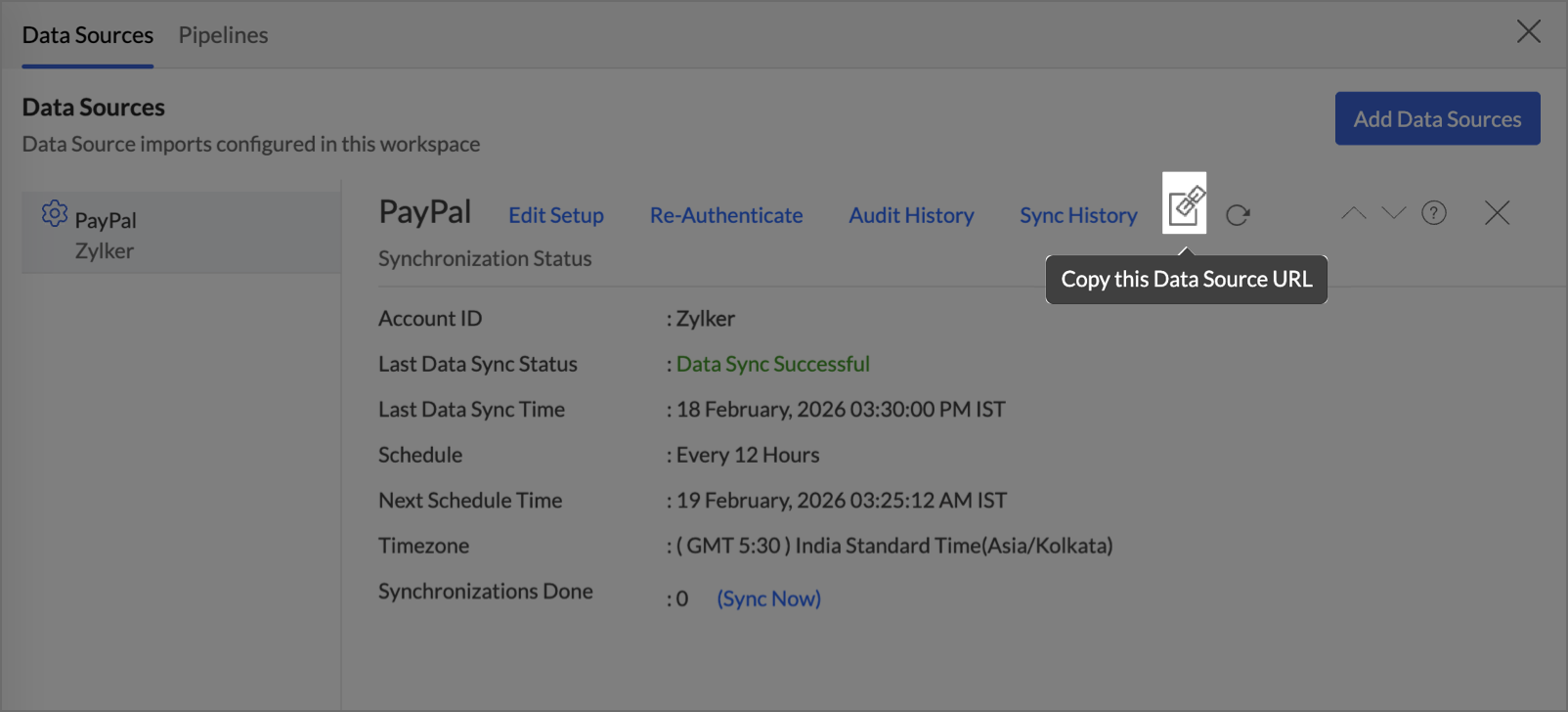 The Data Source Permalink helps you easily access the data source tab. Only the Organization Admin and Account Admin can make changes in the Data sources page, other users can know the synchronization details like whether the last data sync was successful or not, when the last data sync happened, when the next sync is scheduled to happen, etc. This link can also be pasted in dashboards so that everyone accessing the dashboard can know about the sync status.