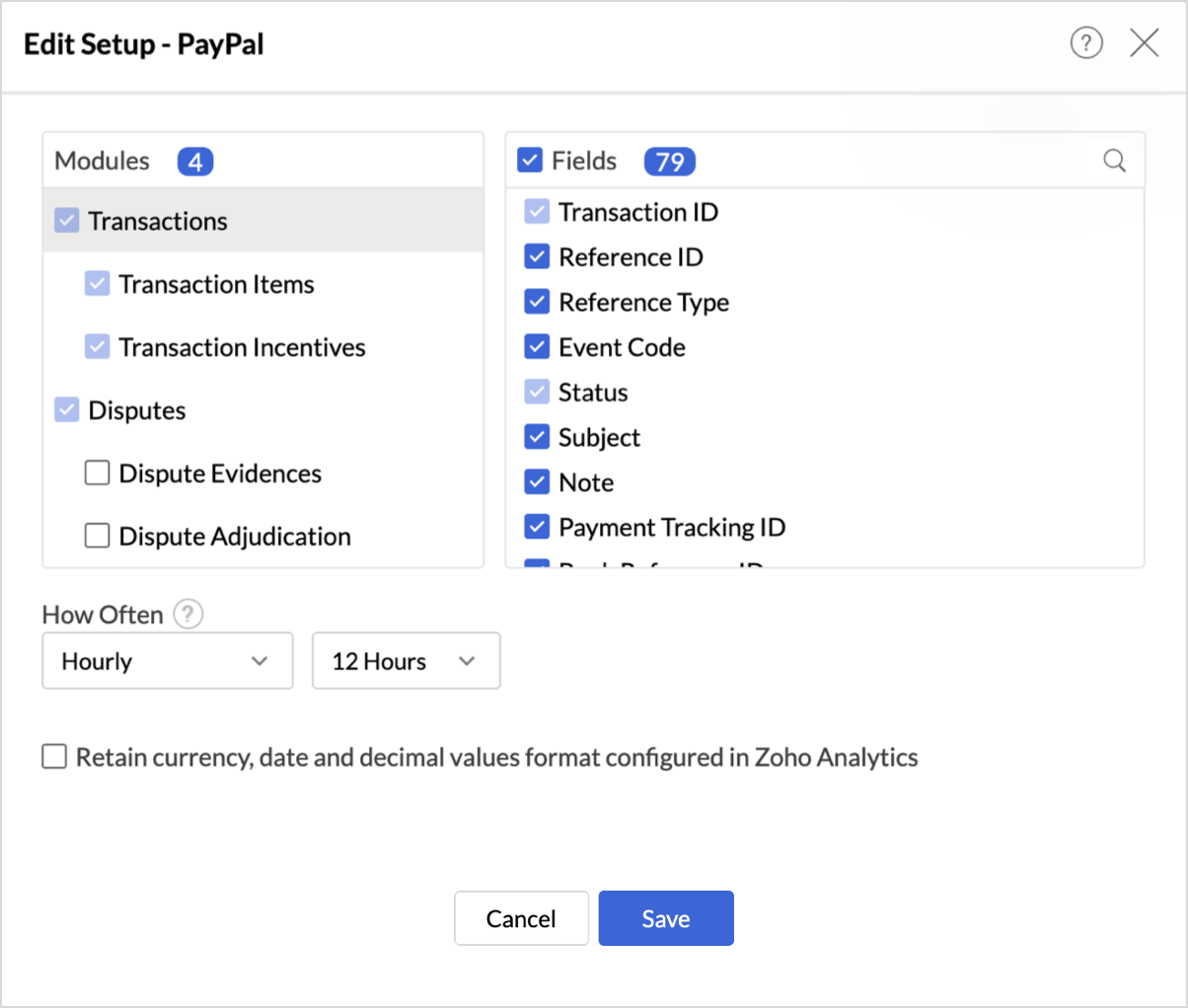 Modules & Fields (What are the modules and fields in PayPal that will be synchronized in Zoho Analytics Workspace?)