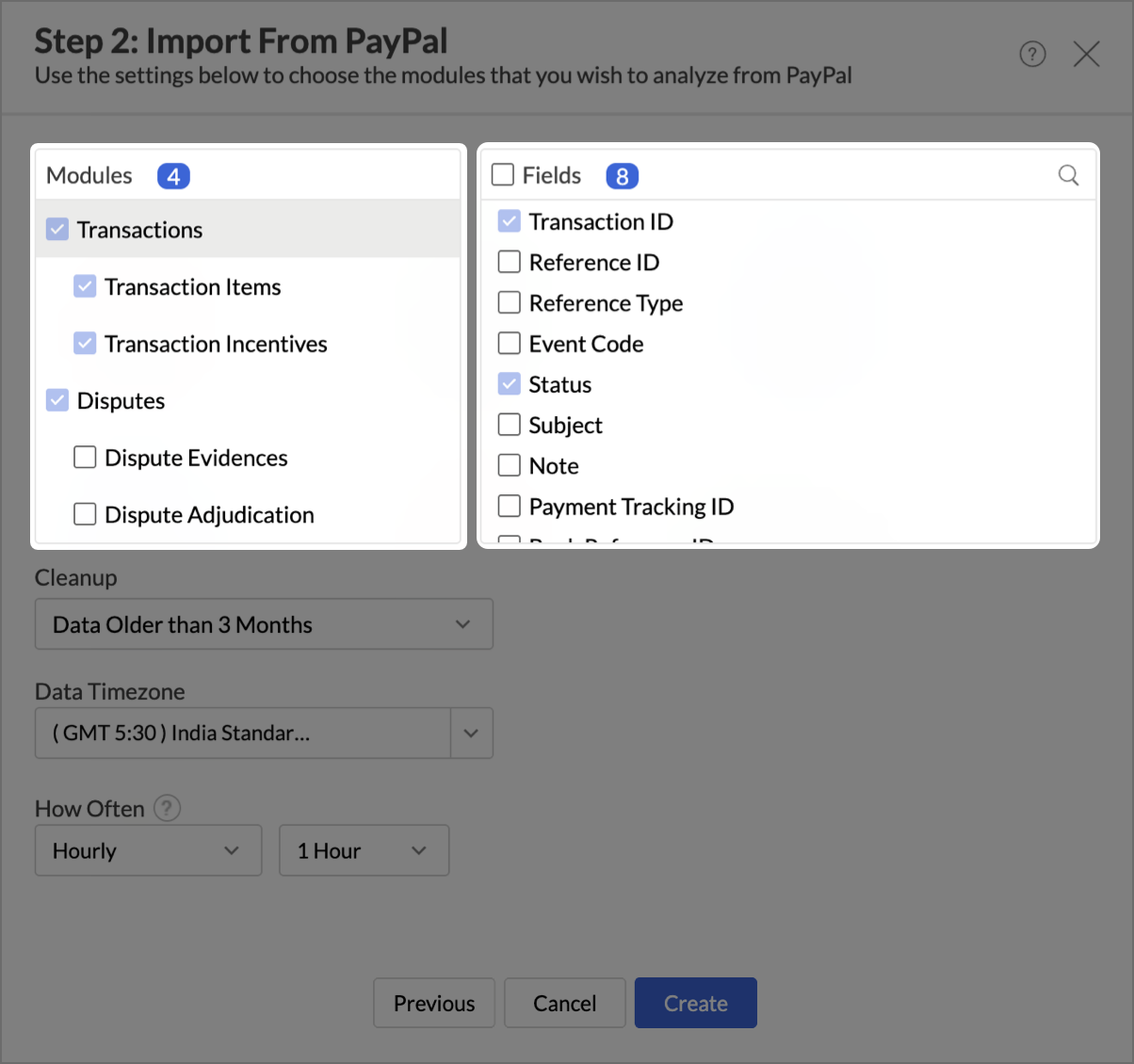 - Once authenticated, select the Modules and Fields from which you intend to import data.
