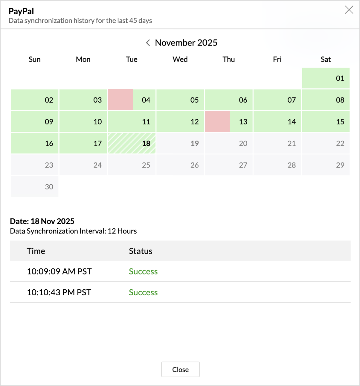 The Sync History tab provides details about the data sync for the last 45 days. A successful data sync is marked in green, and a sync failure is marked in red.