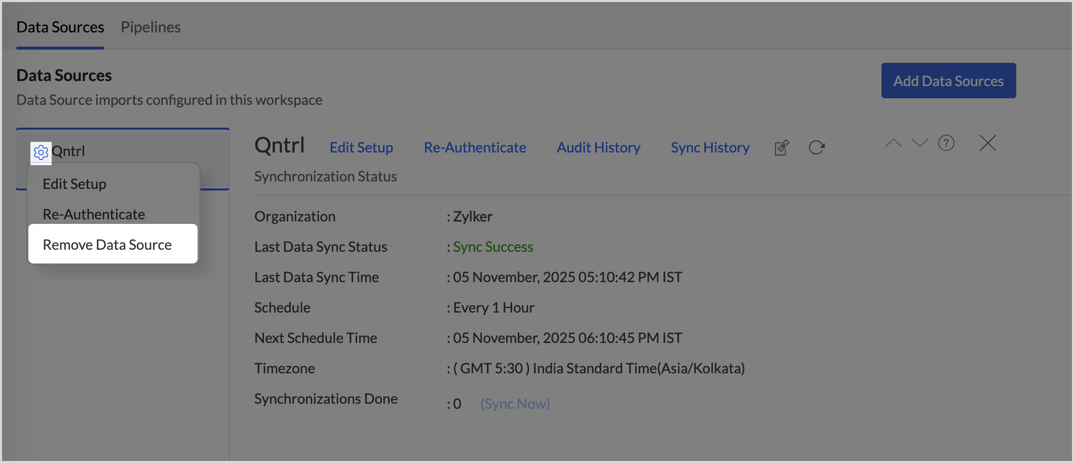 Click the Settings icon in the Data Sources tab, and select Remove Data Source from the drop-down menu.