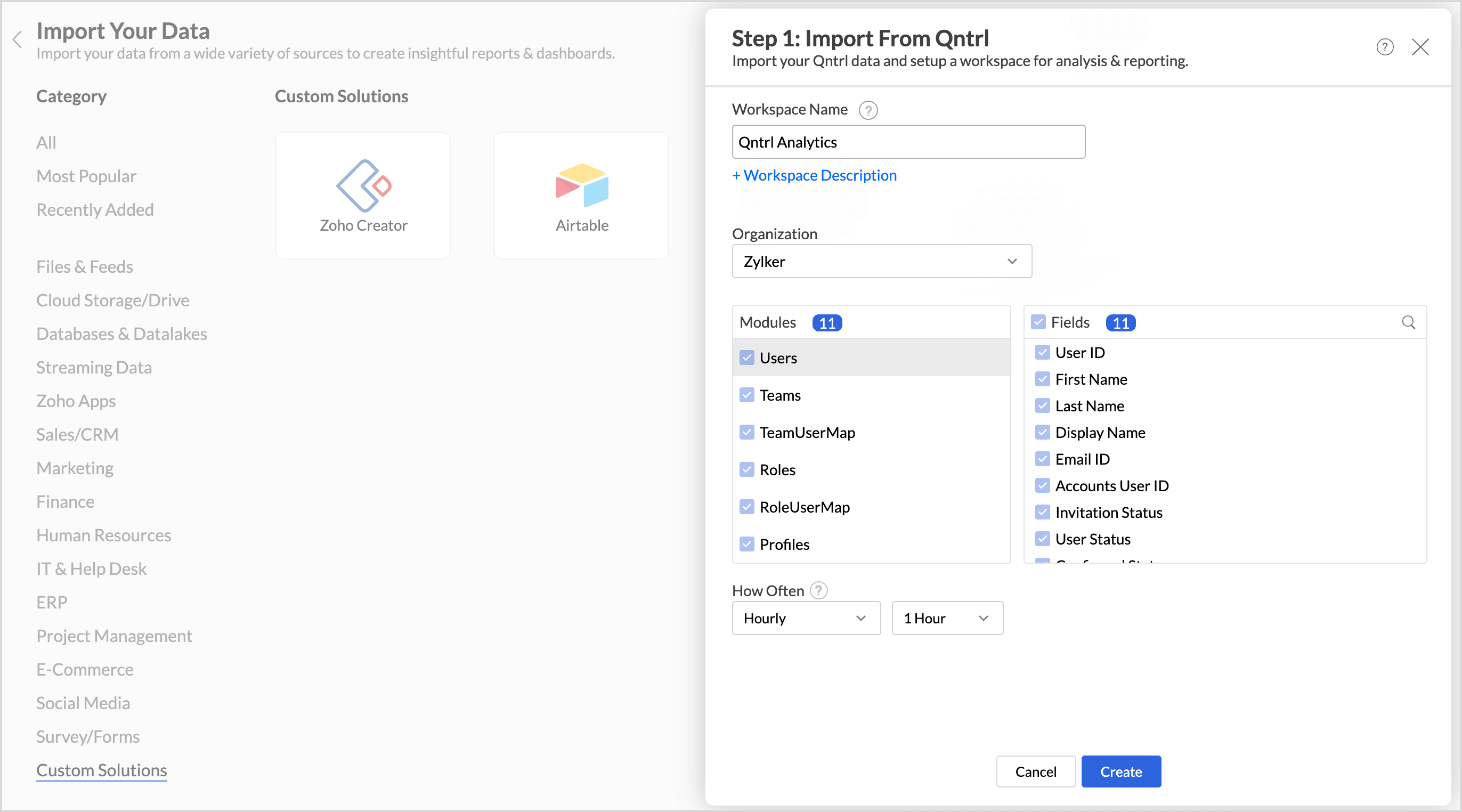 Users with Administrator Privileges can configure the connection between Qntrl and Zoho Analytics.