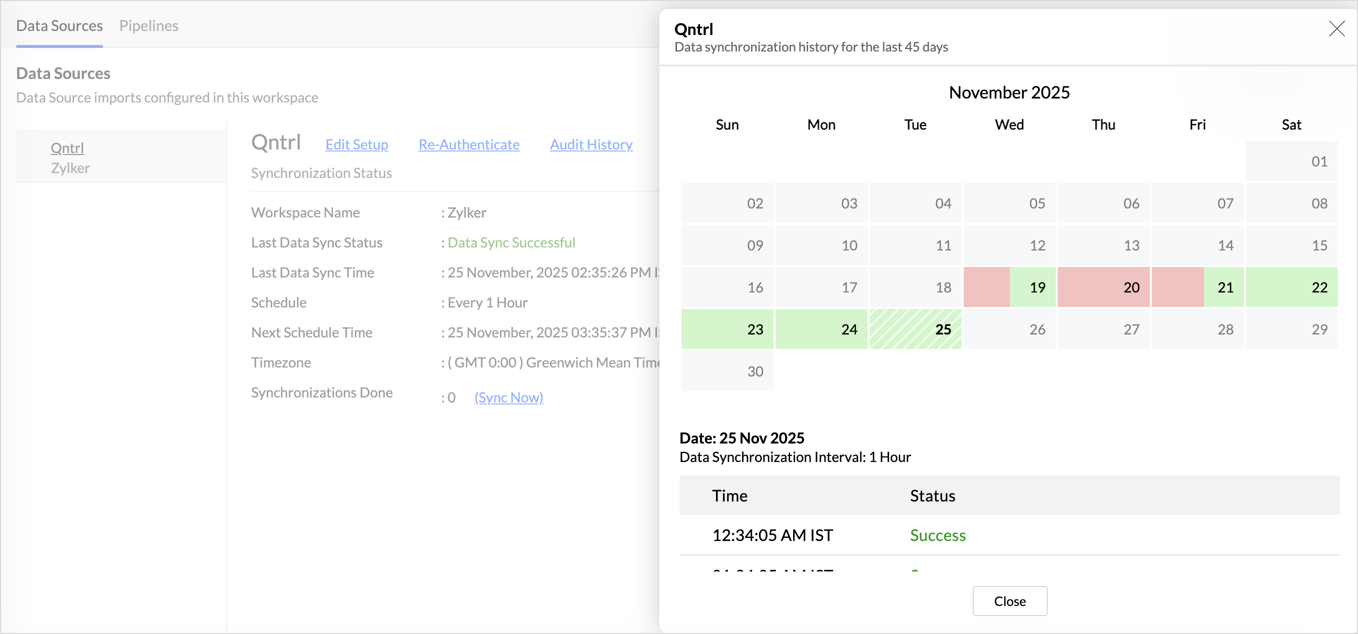 - A calendar with the Sync History of the last 45 days will open. The date when the data sync has happened will be highlighted. Hover to view the number of times the data had been synced on a specific date.