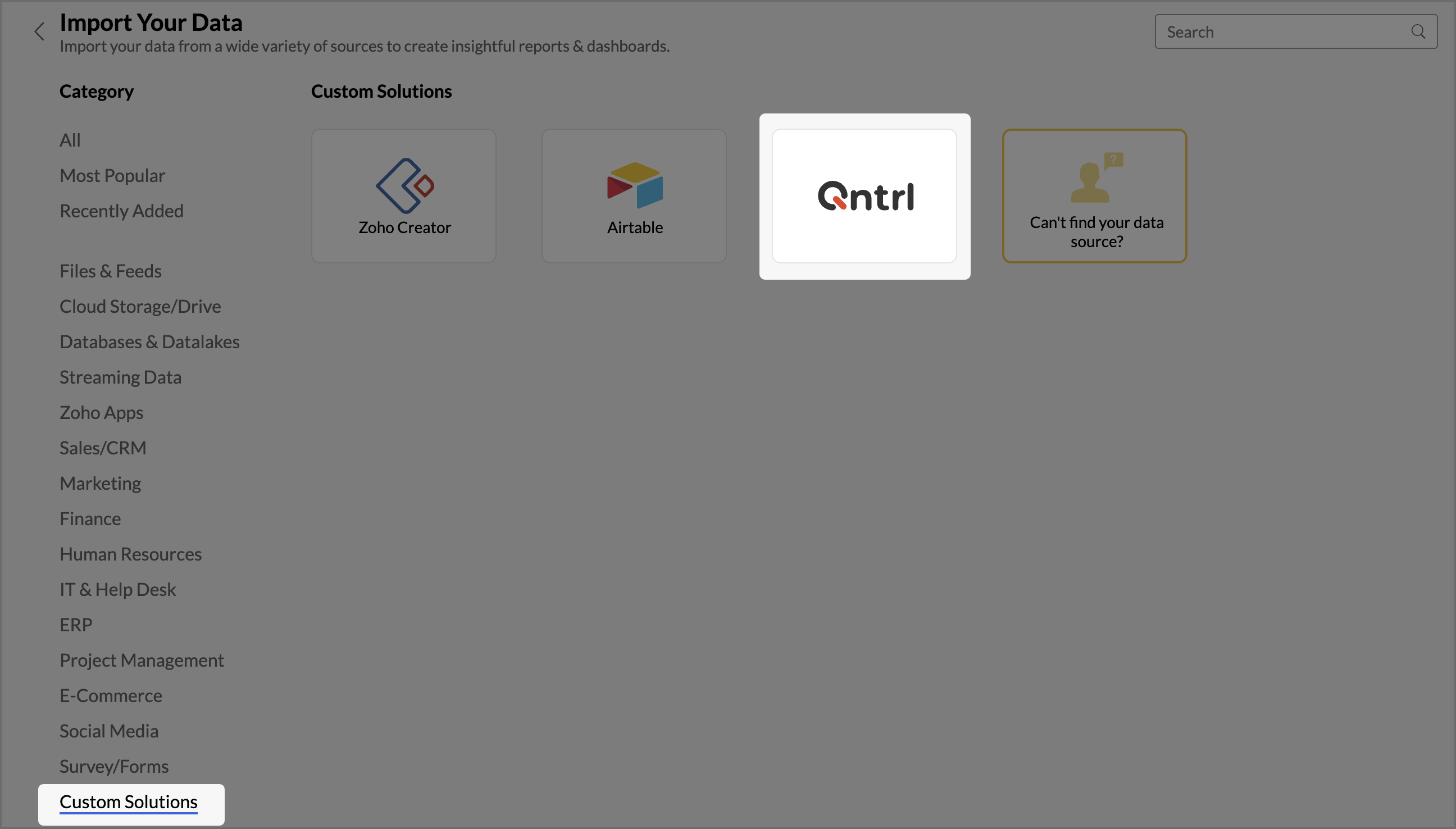 - All the data sources will be listed. Access the Custom Solutions tab and choose Qntrl.