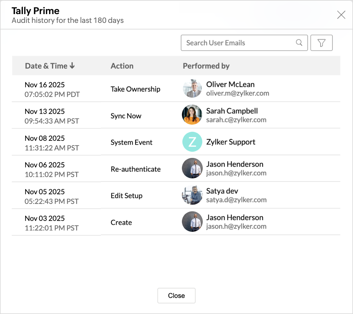 Zoho Analytics logs all the user activities and system events within the TallyPrime workspace. The following actions that are logged in Zoho Analytics,