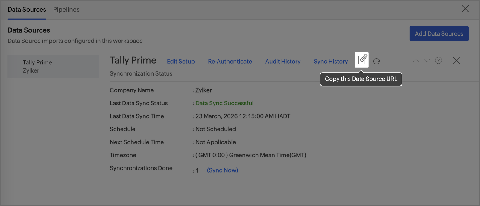 The Data Source Permalink helps you easily access the data source tab. Only the Organization Admin and Account Admin can make changes in the Data sources page, other users can know the synchronization details like whether the last data sync was successful or not, when the last data sync happened, when the next sync is scheduled to happen, etc. This link can also be pasted in dashboards so that everyone accessing the dashboard can know about the sync status.