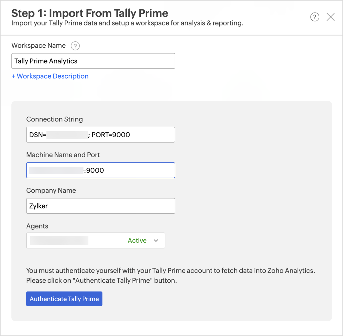 - Click Authenticate TallyPrime. Zoho Analytics will authenticate via the Databridge agent and retrieve your TallyPrime data schema.