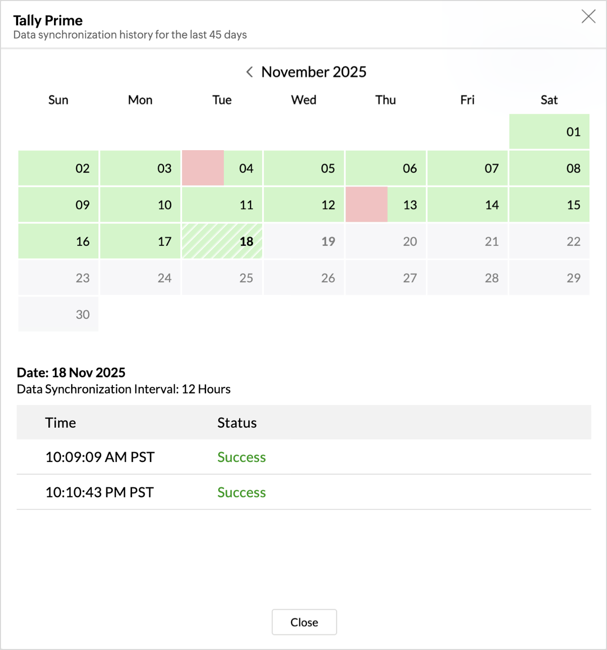 The Sync History tab provides details about the data sync for the last 45 days. A successful data sync is marked in green, and a sync failure is marked in red.