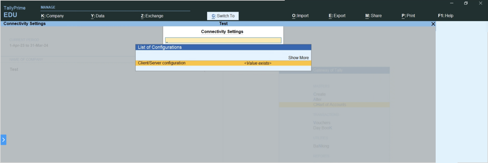 <Machine_Name>:<PORT_Value>Enter the hostname of the machine running TallyPrime, followed by PORT information.