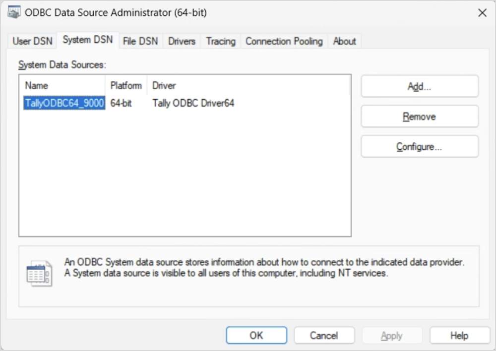 DSN=<DSN_Name>; PORT=<PORT_Value>To find your DSN Name: Search for ODBC Data Source on your system, go to the System DSN tab, and copy the name listed under the 64-bit ODBC Data Source for Tally. Use the Port value you have noted earlier.
