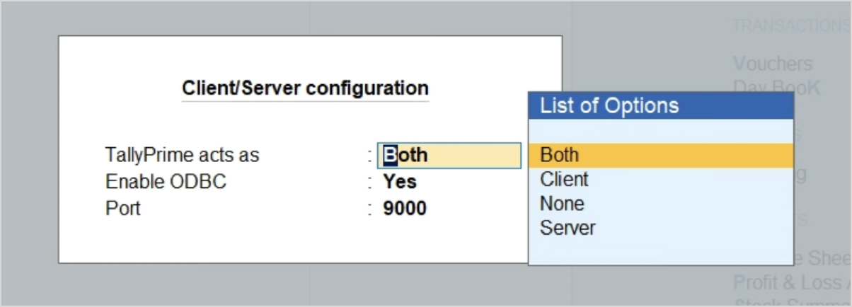 - In the Client / Server Configuration under TallyPrime Acts As, choose the configuration that suits your setup and ensure Enable ODBC is set to Yes.